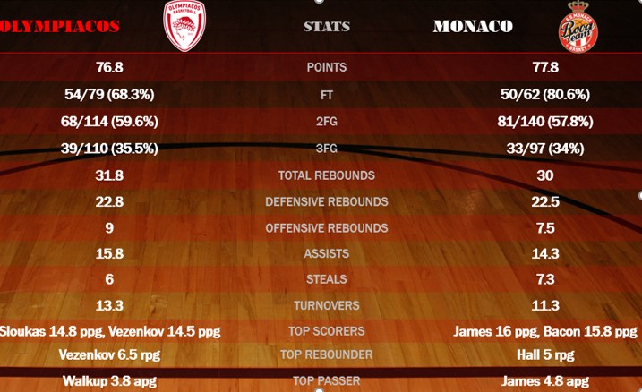 Η «μεγάλη εικόνα» μέχρι τώρα είναι ισορροπημένη, με τον Ολυμπιακό να έχει μπορέσει μεν να επιβάλλει το ρυθμό του στα 3 παιχνίδια, να έχει δε στο σακούλι του 2 νίκες, όσες και η Μονακό. Η πλήρης επικράτηση του πρώτου αγώνα, μέσα από την καλή άμυνα και την ανάδειξη απρόσμενων πρωταγωνιστών από τον πάγκο, όπως οι Πρίντεζης και Ζαν-Σαρλ δεν είχε ανάλογη συνέχεια, με τους ερυθρόλευκους να στηρίζονται σε ένα πυρήνα 6 – 7 παικτών, εκ των οποίων οι δύο (Ντόρσει και Μακίσικ) δεν δείχνουν στην καλύτερη δυνατή κατάσταση. Οι Σλούκας, Βεζένκοβ, Γουόκαπ και Φαλλ έχουν «τραβήξει το κουπί» και ανταποκρίνονται στο μέγιστο βαθμό μέχρι τώρα και η συνεισφορά τους και στο τελευταίο παιχνίδι αναμένεται να είναι μεγάλη.