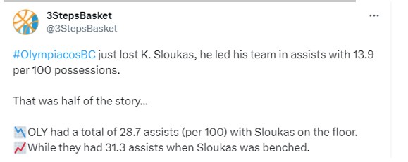 Φυσικά, κάποιος θα έλεγε ότι ο Ολυμπιακός έχει ανάγκη από έναν παίκτη που θα έχει και χαρακτηριστικά δημιουργίας μετά την φυγή του Σλούκα, αλλά η πραγματικότητα είναι ότι ο coach Μπαρτζώκας υπολογίζει σε αυτό το κομμάτι πολύ τους Γκος και Γουόκαπ, ενώ φυσικά υπάρχει η εκτίμηση ότι το σύστημα του Ολυμπιακού μπορεί να παράξει εξαιρετικά αποτελέσματα στη δημιουργία με βάση τον τρόπο παιχνιδιού. Άλλωστε, όπως σημειώσαμε και στο τελευταίο μας podcast, παρότι ο Σλούκας ήταν πρώτος σε ασίστ στον Ολυμπιακό, η ομάδα του χωρίς αυτόν στο παρκέ παρήγαγε 3 ασίστ παραπάνω ανά 100 κατοχές.