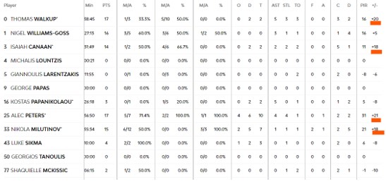 Ωστόσο, η χημεία και η ποιότητα της…πεντάδας (βασικά της τετράδας του Ολυμπιακού) έκανε τη διαφορά: Γουόκαπ, Κάνααν, Βεζένκοβ, Φαλ λέγαμε πέρσι. Γουόκαπ, Κάνααν, Πίτερς (!), Μιλουτίνοβ φαίνεται να είναι φέτος με τους τέσσερις τους να παίζουν ΠΟΛΥ χρόνο και να καταγράφουν εντυπωσιακό +\- για ένα τόσο κλειστό ματς, έχοντας καταπληκτική παρουσία σε όλο το ματς.
