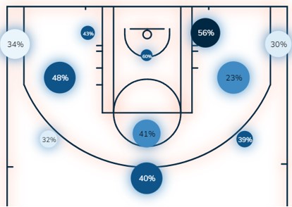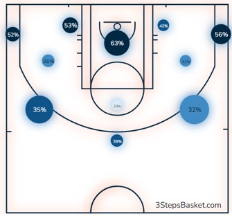 Ο Καμπάτσο έχει σουτάρει τη φετινή σεζόν 2 (ναι, καλά διαβάσατε) midrange σουτ και η drop άμυνα του ΟΣΦΠ θα είναι το μεγαλύτερο του όπλο ώστε να οδηγήσει τον Αργεντίνο σταρ σε αυτή τη περιοχή. Ο Ολυμπιακός επιτρέπει ελάχιστα σουτ μέσα στη ρακέτα του, όπως βλέπουμε και στο shot chart των αντιπάλων του.