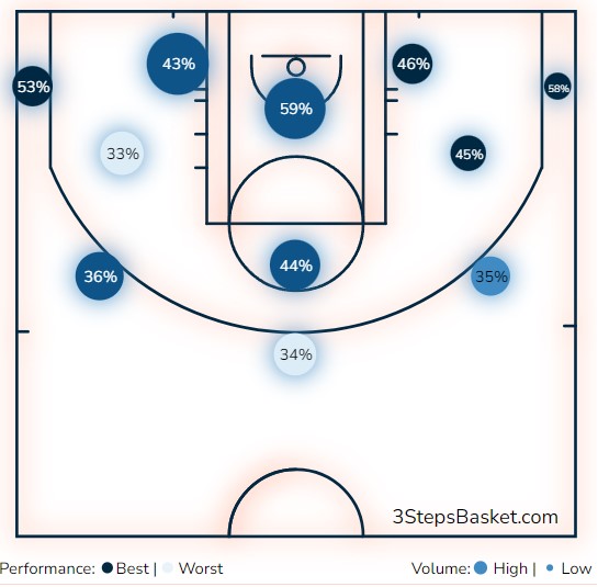 Όπως βλέπουμε στο shot chart της, είναι μια ομάδα που σκοράρει και στα τρία επίπεδα με την ίδια άνεση. Το σημείο κλειδί για τον Ολυμπιακό θα πρέπει να είναι να μην επιτρέψει η Μπαρτσελόνα να βρει ρυθμό μέσα από τους χειριστές της στη δημιουργία για midrange παιχνίδι. Εκεί ζει και ο Γιάν Βέσελι, ο οποίος θυμίζει τον παλιό καλό Βέσελι και σκοράρει ασταμάτητα από αυτήν την περιοχή. Την ίδια στιγμή, με την Μπάρτσα να γυρίζει την μπάλα και να ακροβολεί τους σουτέρ της στη γωνία, όπου σουτάρει 55% για τρεις συνολικά (!), ο coach Μπαρτζώκας θα πρέπει να βρει τρόπο να μην αφήσει ελεύθερα αυτά τα σουτ. Αυτό πιθανότατα σημαίνει να οδηγήσει την Μπάρτσα στο ποστ και να μην δώσει πολλές βοήθειες σε αυτές τις καταστάσεις.