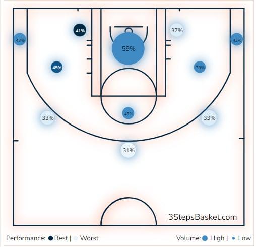 Η ομάδα του Σάρας είναι μια ομάδα που σκοράρει και στα τρία επίπεδα. Ο Ολυμπιακός θα πρέπει να μην επιτρέψει τη Φενέρ να βρει ρυθμό από τους χειριστές της καθώς είναι μια ομάδα που σουτάρει με το συνολικό 40% για τρεις. Ο coach Μπαρτζώκας θα πρέπει να χαμηλώσει τον ρυθμό του παιχνιδιού μιας και η επίθεση του Ολυμπιακού σκοράρει κατά μ.ο 78.8 πόντους, σε αντίθεση με την Φενέρ που βρίσκεται στους 85.2. Θα πρέπει να περιορίσει αυτά τα σουτ και να οδηγήγει την Φενέρ πιθανότατα στο ποστ, αλλά κυρίως να επιτεθεί στην ρακέτα, που όπως βλέπουμε στο shot chart της εκεί είναι το σημείο που υστερεί αμυντικά.
