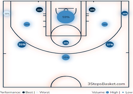 Η Μπαρτσελόνα δεν φημίζεται για ομάδα που της αρέσει το τρίποντο. Πρόκειται όμως για μία ομάδα με υψηλού επιπέδου γκαρντ, που αν τους αφήσεις ελεύθερους μπορούν να σε τιμωρήσουν χωρίς δεύτερη σκέψη. Έτσι και έγινε λοιπόν. Ο Ολυμπιακός πλήρωσε τα λάθη στην άμυνα, έδωσε λάθος βοήθειες κυρίως με τον Μακκίσικ, με αποτέλεσμα η ομάδα των Μπλαουγκράνα να κρατηθεί στο παιχνίδι με δύο τρίποντα του Αμπρίνες και του Σατοράνσκι. Η ομάδα του Γκριμάου σούταρε με 44% πίσω από την γραμμή των 6.75μ σε αντίθεση με τους ερυθρόλευκους που σούταραν με μόλις 27%. Αν και η Μπαρτσελόνα είναι μια ομάδα που αρέσκεται να παίζει κυρίως στη ρακέτα, όπως βλέπουμε και από το shot chart της σουτάρει με το συνολικό 39% για τρεις, κάτι το οποίο τα υψηλά γκαρντ της δεν θα αφήσουν ανεκμετάλλευτο εφόσον τους δώσεις την ευκαιρία.