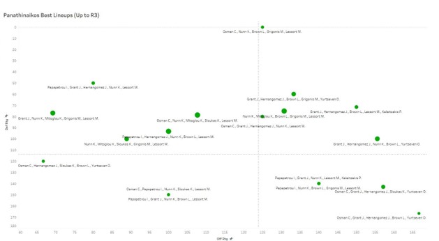 Ένα από τα βασικά χαρακτηριστικά που έκανε τον ΠΑΟ πέρσι να ανεβάζει ρυθμούς από τον ερχομό του Κέντρικ Ναν και μετά, ήταν τα αυστηρά και κλειστά ροτέισον. 3 αγωνιστικές μέσα στη σεζόν φέτος και αυτό έχει αλλάξει με τον coach Αταμάν να έχει χρησιμοποιήσει 15 (!) διαφορετικά lineups που έχουν παίξει συγκεκριμένο αριθμό κατοχών με τα ερωτήματα για το τί μέλλει γενέσθαι στις θέσεις 3 & 4 να είναι μεγαλύτερα από ότι αναμενόταν. O Χουάντσο παίζει 20', ο Μήτο 14', ο Γκριγκόνις 14.5', o Οσμάν 13.5, ο Παπαπέτρου 12.3', ενώ χρόνο εκεί έχουν πάρει και οι Καλαϊτζάκης, Λορένζο, Ναν & Γκραντ! Είναι σαφές ότι ο Αταμάν ψάχνει να βρει την ιδανική λύση και ίσως για να βοηθηθεί αξίζει μια ματιά στα analytics μας: