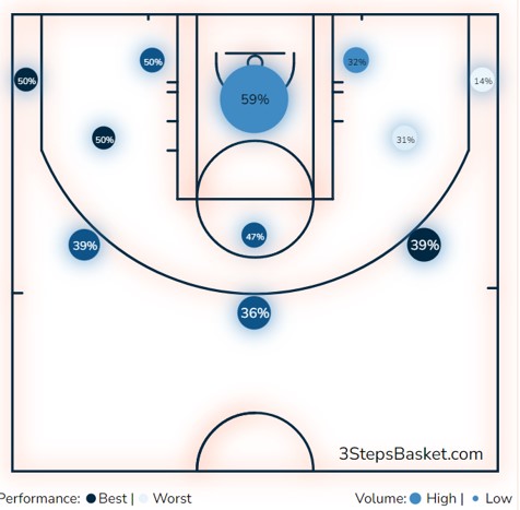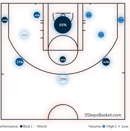 Η Μακάμπι επιτρέπει τους αντιπάλους της να σουτάρουν αποτελεσματικά πίσω από την γραμμή των 6.75μ. Και αυτό φαίνεται και από το short chart της παρακάτω. Οι ερυθρόλευκοι πρέπει να εκμεταλλευτούν τα ελεύθερα σουτ που θα δημιουργηθούν από τη motion επίθεση του. Φυσικά η παρουσία των Μιλουτίνοφ-Φαλ αλλά και Βεζένκοβ στη ρακέτα θα κάνει τη διαφορά καθώς η Μακάμπι δεν έχει το αντίστοιχο μέγεθος στις αντίστοιχες θέσεις. Ο Ολυμπιακός έρχεται υποψιασμένος από μέτρια εμφάνιση και οφείλει να είναι πιο προσεκτικός. Αν καταφέρει να ελέγξει τα ριμπάουντ και τον ρυθμό του παιχνιδιού, έχει το πάνω χέρι για την νίκη.