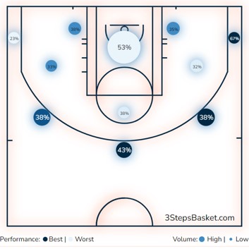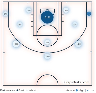 Από τους καλύτερους αν όχι ο καλύτερος σε catch and shoot παίκτης, 62% σε true shooting φέτος, 57% για τρεις και 64% σε catch and shoot. Αυτή τη στιγμή βρίσκεται μόλις στο 14% usage, οι κατοχές που περισσεύουν για τον Πίτερς είναι πολύ λίγες, αλλά θα είναι plug and play στο σύστημα του Ολυμπιακού. Δίπλα στον Πίτερς, ο coach Μπαρτζώκας ίσως επιλέξει για εκτεταμένα λεπτά τον Μουσταφά Φαλ, προκειμένου να ανεβάσει και αυτός την απόδοση του, σε μια πεντάδα ίδια με την περσινή εκτός φυσικά του Έβαν Φουρνιέ. Όποτε αγωνίζεται η ομάδα του είναι καλύτερη κατά 23 πόντους ανά 100 κατοχές από τον αντίπαλο της. Η Μπασκόνια δεν είναι σε καλή κατάσταση, ούτε αποτελεί κάποιο φόβητρο. Ίσως αποτελεί και ευκαιρία για τον Πίτερς να πάρει τα σουτ που επιθυμεί, καθώς όπως βλέπουμε από το short chart της, οι αντίπαλοι της σημειώνουν αξιόλογα ποσοστά πίσω από την γραμμή των 6.75μ. .