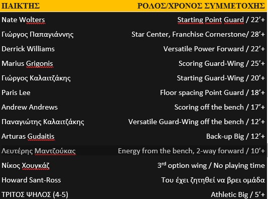 - Τρίτος ψηλός που να παίζει στο 4-5 και να μπορεί να παίξει πίσω από τον Williams, αλλά να μοιράζεται το χρόνο με τον Μαντζούκα