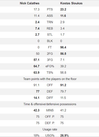 Στον πίνακα από το 3stepsbasket.com βλέπουμε την σύγκριση μεταξύ των δύο ηγετών της περιφερειακής γραμμής των ομάδων σε στατιστικά αναγόμενα στις 75 κατοχές, αριθμός που θεωρείται ο ιδανικός για να καταλάβει κανείς την επιρροή σε κλίμακα ολόκληρου αγώνα.