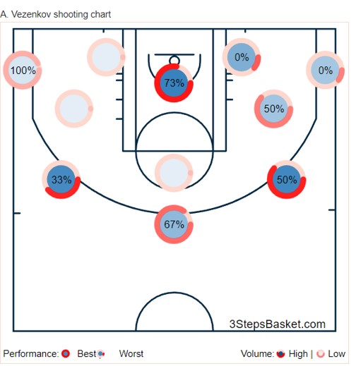 Οι επιλογές του είναι βγαλμένες από τα καλύτερα όνειρα ενός αναλυτή του ΝΒΑ, μιας και παίρνει αυστηρά τις προσπάθειές του από το τρίποντο και από τη ρακέτα, είτε μετά από κόψιμο είτε μετά από επιθετικό ριμπάουντ. Το midrange του είναι περιορισμένο σε λίγες προσπάθειες από το δεξί midpost, όπου και εκεί είναι εξαιρετικά αποτελεσματικός! Γιατί λοιπόν τα στατιστικά επιβεβαιώνουν ότι ο σταρ του ΟΣΦΠ είναι ο πιο αποτελεσματικός παίκτης; Μα φυσικά, όταν σουτάρεις τα δύο πιο αποτελεσματικά σουτ ανά κατοχή στο σύγχρονο μπάσκετ, τότε είναι λογικό να έχεις τέτοια ποσοστά, έχοντας 70% True Shooting! Aν δει κανείς την ομοιότητα του shot chart του Vezenkov με κάποιο τεσσάρι του ΝΒΑ με σοβαρό ρόλο σε ομάδα, όπως για παράδειγμα του Cameron Johnson των Suns θα καταλάβει ακριβώς για ποιο πράγμα μιλάμε!