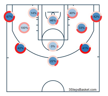 Φέτος στον Ολυμπιακό οι ανάγκες είναι διαφορετικές. To usg% του είναι στο 21% και το volume του πολύ χαμηλότερο. Το αποτέλεσμα είναι ο ίδιος να μη μπορεί να βρει ρυθμό και αυτό είναι κάτι που φαίνεται ακόμη και στα ματς που είναι καλός, μιας και ξεκινά δυνατά στα τελευταία παιχνίδια, αλλά με την πάροδο του χρόνου η απόδοσή του πέφτει.