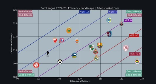 Ας δούμε για αρχή το γράφημα του 3stepsbasket. Όπως βλέπουμε, η ομάδα του coach Ράντονιτς είναι στη δυσάρεστη θέση να είναι από τις ομάδες που αποτυπώνουν στατιστικά την βαθμολογική τους κατάσταση. Με ρεκόρ 2-6, ο ΠΑΟ έχει κάθε λόγο να ανησυχεί μιας και βρίσκεται στο πολύ μικρό group ομάδων με κακή επίθεση και κακή άμυνα. Ο Bacon έχει φέρει χαμόγελα στους φίλους της ομάδας λόγω της ποιότητας του, ο Παπαγιάννης έχει ανέβει σταδιακά, αλλά το καλοκαιρινό οικοδόμημα δεν ήταν αρκετά καλό εξ’αρχής. Ο Παναθηναϊκός δεν έχει βρει ακόμη την ταυτότητά του σε καμία από τις δύο πλευρές του παρκέ, ενώ υπάρχει αστάθεια όσον αφορά την φυσιογνωμία και τους στόχους της ομάδας στο μέλλον. Ο αρχικός σχεδιασμός έδειξε μια προσπάθεια για να χτιστεί μια ομάδα για το μέλλον, όμως οι αμέσως επόμενες κινήσεις με αποκορύφωμα φυσικά τις κινήσεις για παίκτες όπως ο Ponitka και ο Βacon δείχνουν ότι τα μάτια είναι στραμμένα προς τη διεκδίκηση των play-off. Ποιο από όλα όμως είναι η πραγματική κατεύθυνση; Αυτό είναι ένα ερώτημα που θα απαντηθεί πιθανώς τους επόμενους μήνες.