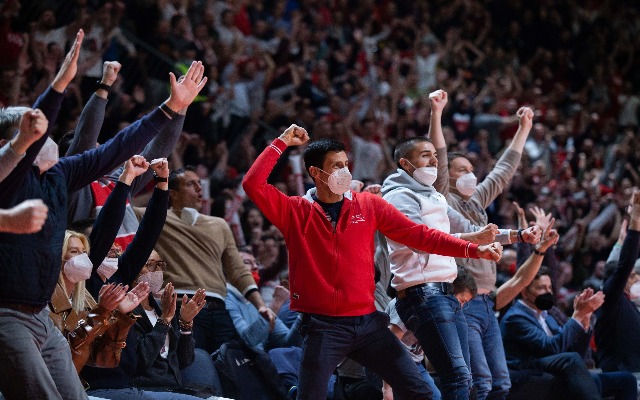 Ο γνωστός τενίστας, Νόβακ Τζόκοβιτς παρακολουθεί από το γήπεδο Αλεκσάνταρ Νίκολιτς Χολ, τον αγώνα του Ερυθρού Αστέρα με τη Μακάμπι Τ.Α. φορώντας τη μάσκα του.