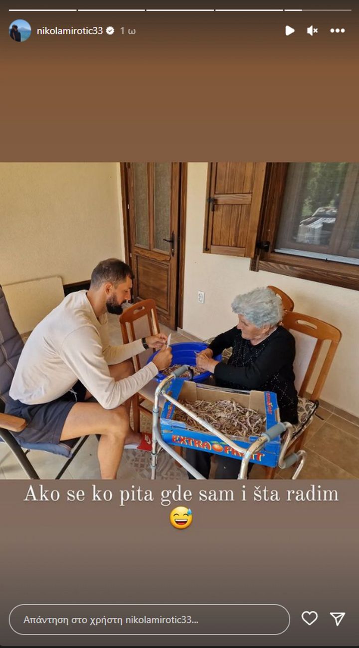 Δεν εξηγείται διαφορετικά η ανάρτηση του παίκτη στο Instagram, στην οποία δείχνει τον ίδιο να καθαρίζει… φασολάκια με μια γιαγιά (!), με τον Μίροτιτς να γράφει χαρακτηριστικά: "Σε περίπτωση που κάποιος αναρωτιέται πού είμαι και τι κάνω".