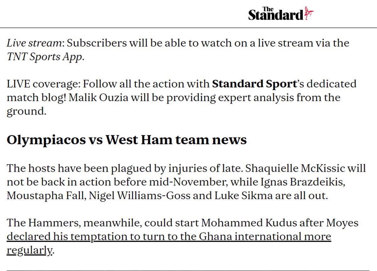 Κάπου… έχασαν την μπάλα οι Άγγλοι, ενόψει του ποδοσφαιρικού αγώνα του Ολυμπιακού με την Γουέστ Χαμ (26/10, 19:45), καθώς στο ρεπορτάζ τους έμπλεξαν τους τραυματίες παίκτες του Ντιέγκο Μαρτίνεθ, με αυτούς του…. Γιώργου Μπαρτζώκα!