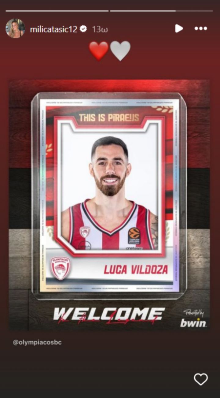 Έτσι, με ανάρτηση της η Μιλίτσα Τάσιτς, στήριξε τον σύντροφο της για την απόφαση του, αναδημοσιεύοντας το post της ΚΑΕ Ολυμπιακό, προσθέτοντας δύο καρδιές, μία κόκκινη και μία λευκή.