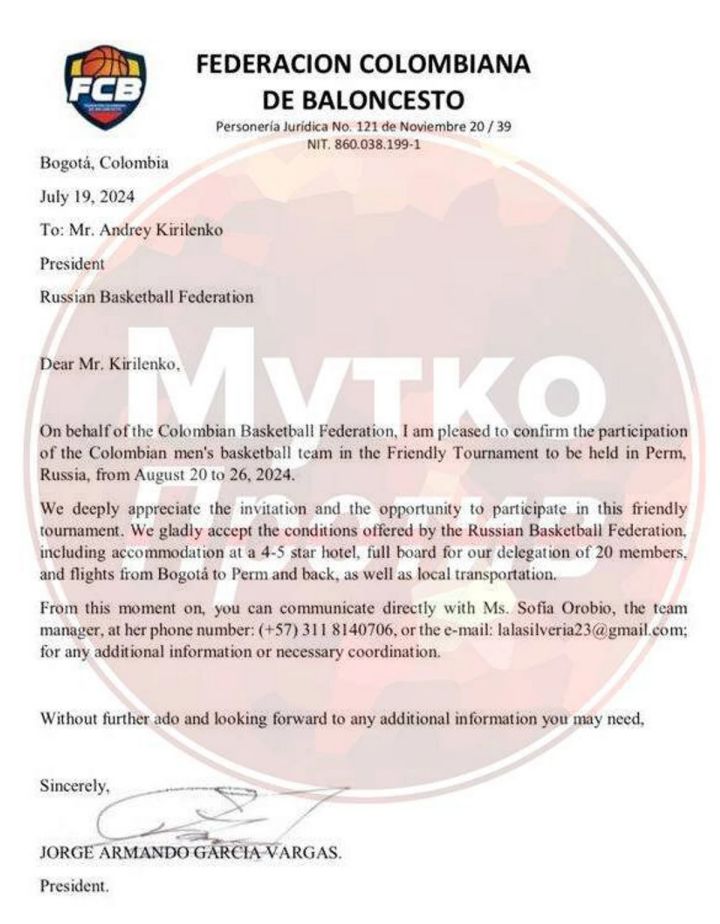 "Η Ομοσπονδία Μπάσκετ της Κολομβίας ενημερώνει ότι μετά από πολλαπλές αναφορές ψηφιακών ΜΜΕ, παρουσιάζεται μια υποτιθέμενη συμμετοχή της εθνικής ομάδας σε φιλικό τουρνουά στη Ρωσία. Σας πληροφορούμε και σας προειδοποιούμε με σεβασμό ότι η Ομοσπονδία δεν έλαβε ποτέ επίσημη πρόταση για να συμμετάσχει στο τουρνουά, ότι η Ομοσπονδία δεν έστειλε καμία ομάδα στην Ρωσία και ότι θα λάβει κάθε νομικό μέτρο απέναντι σε όσους εκμεταλλεύτηκαν την εικόνα και το λογότυπό της", ανέφερε χαρακτηριστικά η ανακοίνωση της ομοσπονδίας της Κολομβίας, ενώ από την πλευρά του, ο Αντρέι Κιριλένκο, πρόεδρος της ρωσικής ομοσπονδίας, εξήγησε τι συνέβη.