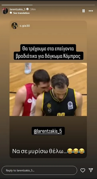 “Θα τρέχουμε στα επείγοντα βραδιάτικα για δάγκωμα κόμπρας”, έγραψε χαρακτηριστικά ο Γιαννόπουλος, ανεβάζοντας την σχετική φωτογραφία με το… δάγκωμα του Λαρεντζάκη, με τον παίκτη του Ολυμπιακού να αποκρίνεται πως ήθελε απλά να τον… μυρίσει!