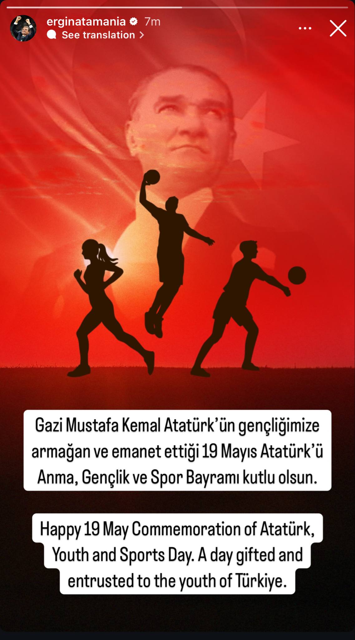 Μετά τον Τσέντι Όσμαν και ο Εργκίν Αταμάν, με ανάρτηση του στα social media, έστειλε το μήνυμα του για την «ημέρα μνήμης του Ατατούρκ και νεολαίας και αθλητισμού» της χώρας του.