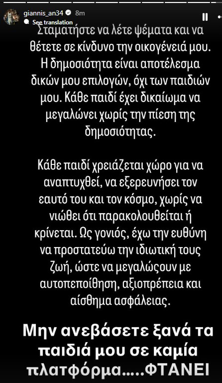 Έτσι, με μία κίνηση για να προστατέψει την ιδιωτική τους ζωή, ο «Greek Freak» ζήτησε κανείς και ποτέ ξανά να μην ανεβάζει τα παιδιά του σε καμία πλατφόρμα.
