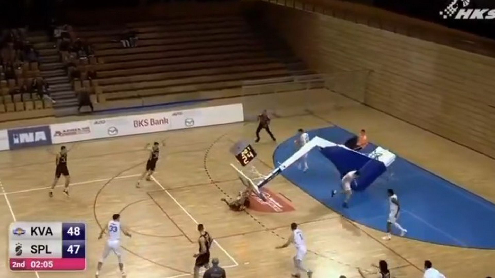 Ευτυχώς για τον ίδιο, δεν τραυματίστηκε, με τους παίκτες των δύο ομάδων να τον… απελευθερώνουν από την μπασκέτα, την οποία και επανάφεραν στην θέση της.