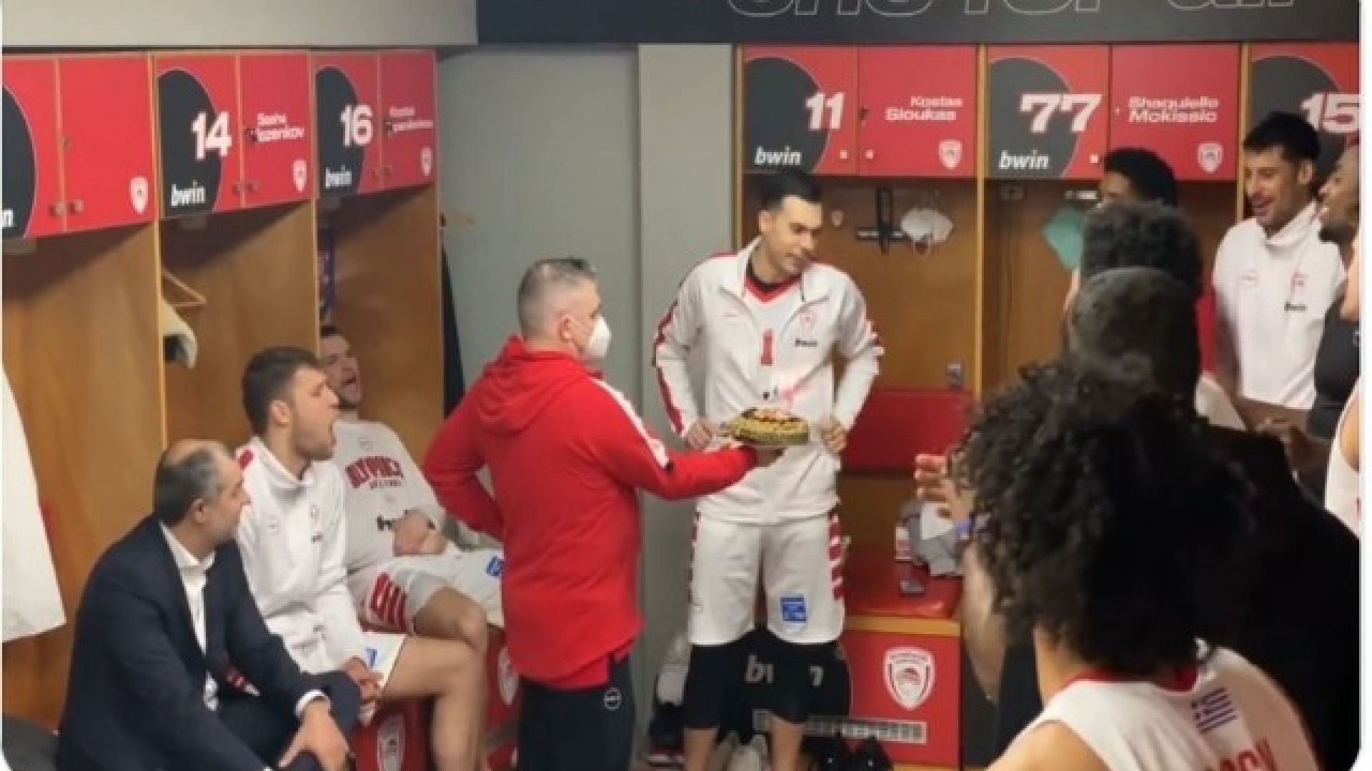 Μετά την εντός έδρας νίκη του Ολυμπιακού επί του Ιωνικού με 109-65, οι άνθρωποι των ερυθρολεύκων έκαναν έκπληξη με μια τούρτα στα αποδυτήρια για τον Κώστα Σλούκα, ο οποίος, το Σάββατο (15/1), έκλεισε τα 32 του χρόνια, με τους προπονητές, τους παίκτες και όλο το επιτελείο να του τραγουδούν τα "χρόνια πολλά".