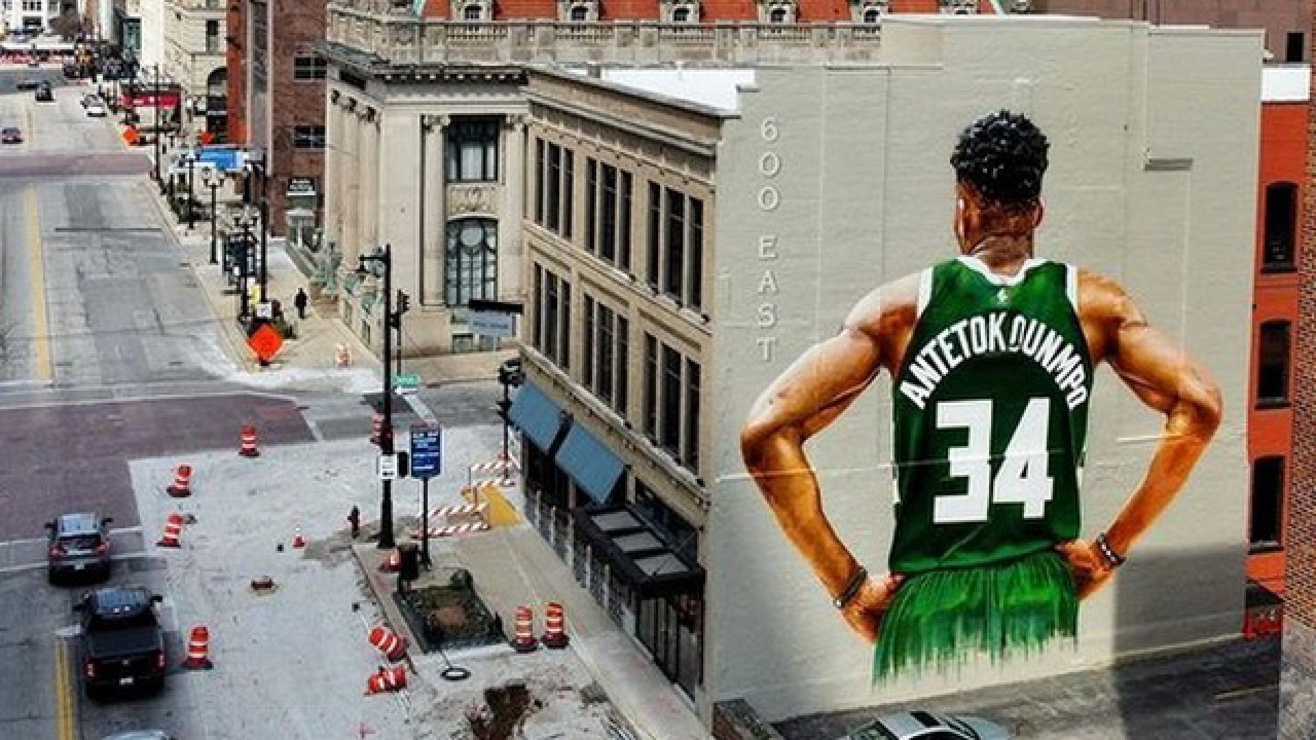 Η μορφή του Γιάννη Αντετοκούνμπο με την φανέλα των Μπακς κοσμεί ένα κτίριο τριών ορόφων στο Μιλγουόκι.