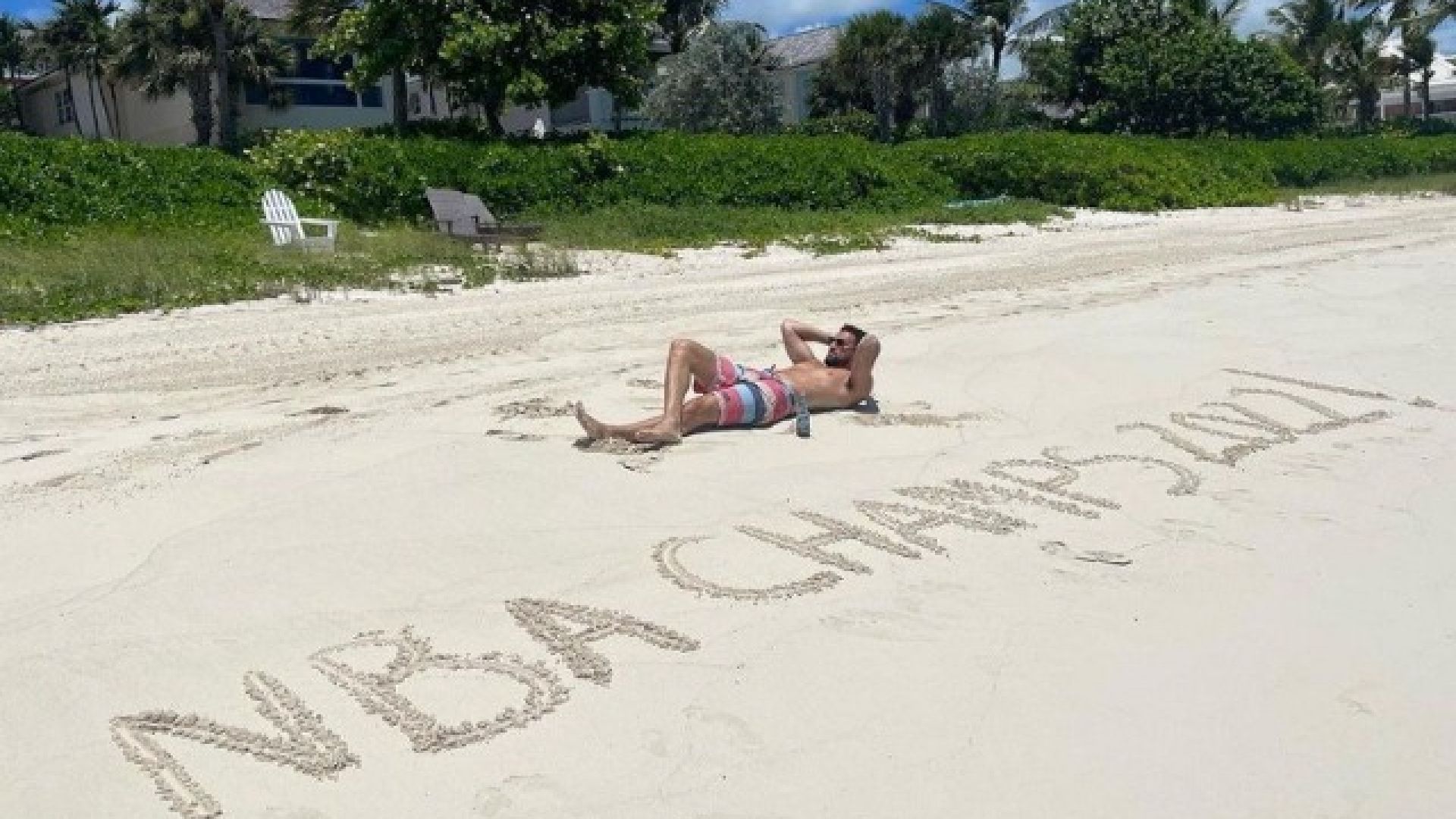 Ο Τόμπσον κάνει διακοπές στις Μπαχάμες και σε μια παραλία έγταψε στην άμμο, ότι έγινε πρωταθλητής του NBA .