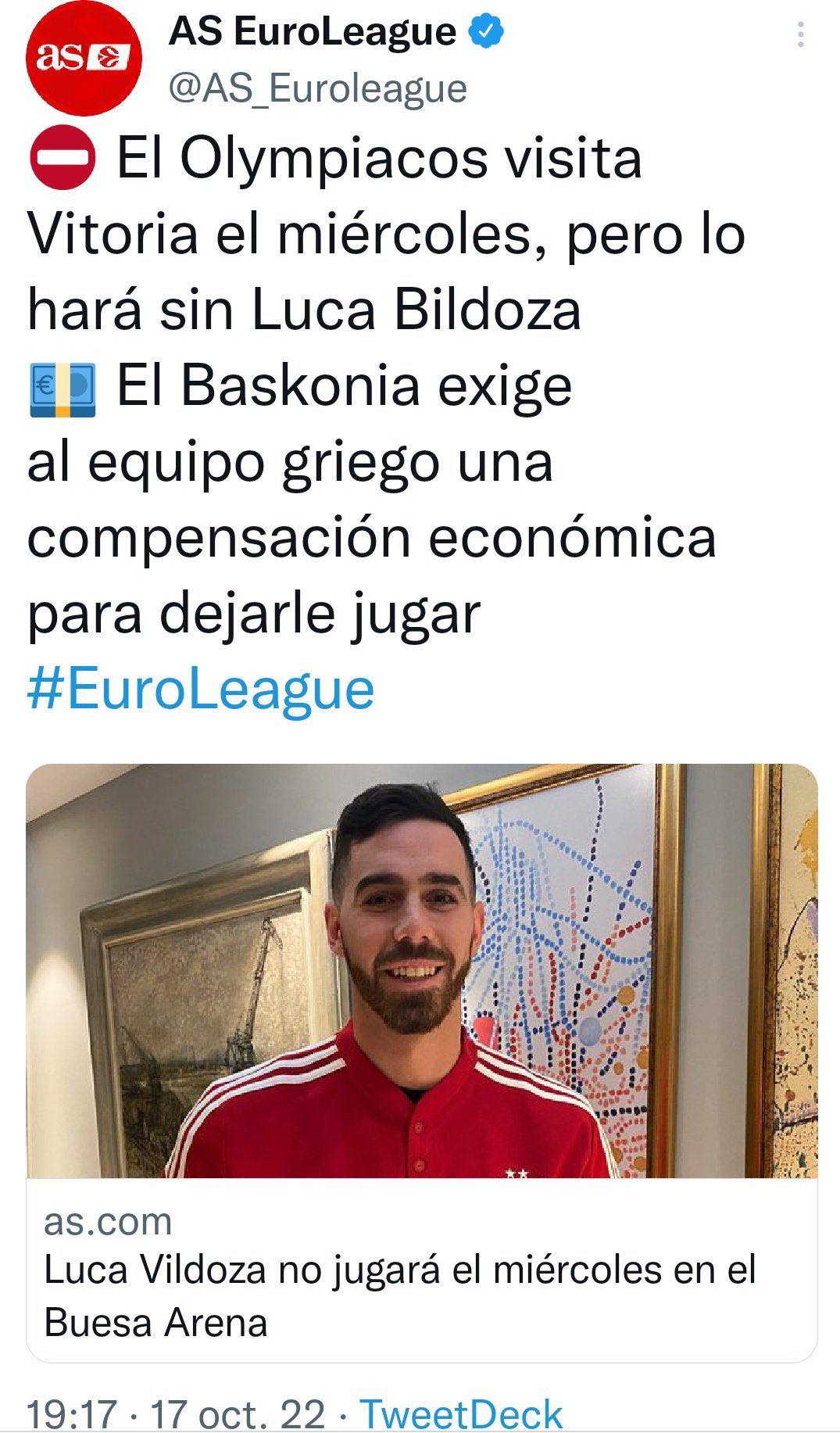 Τον Ολυμπιακό με τον Ερυθρό Αστέρα μπέρδεψε η ηλεκτρονική έκδοση της AS, με το ισπανικό μέσο να αναφέρει ότι η Μπασκόνια ζητά χρήματα από την ελληνική ομάδα προκειμένου να αγωνιστεί ενάντια στους Βάσκους.