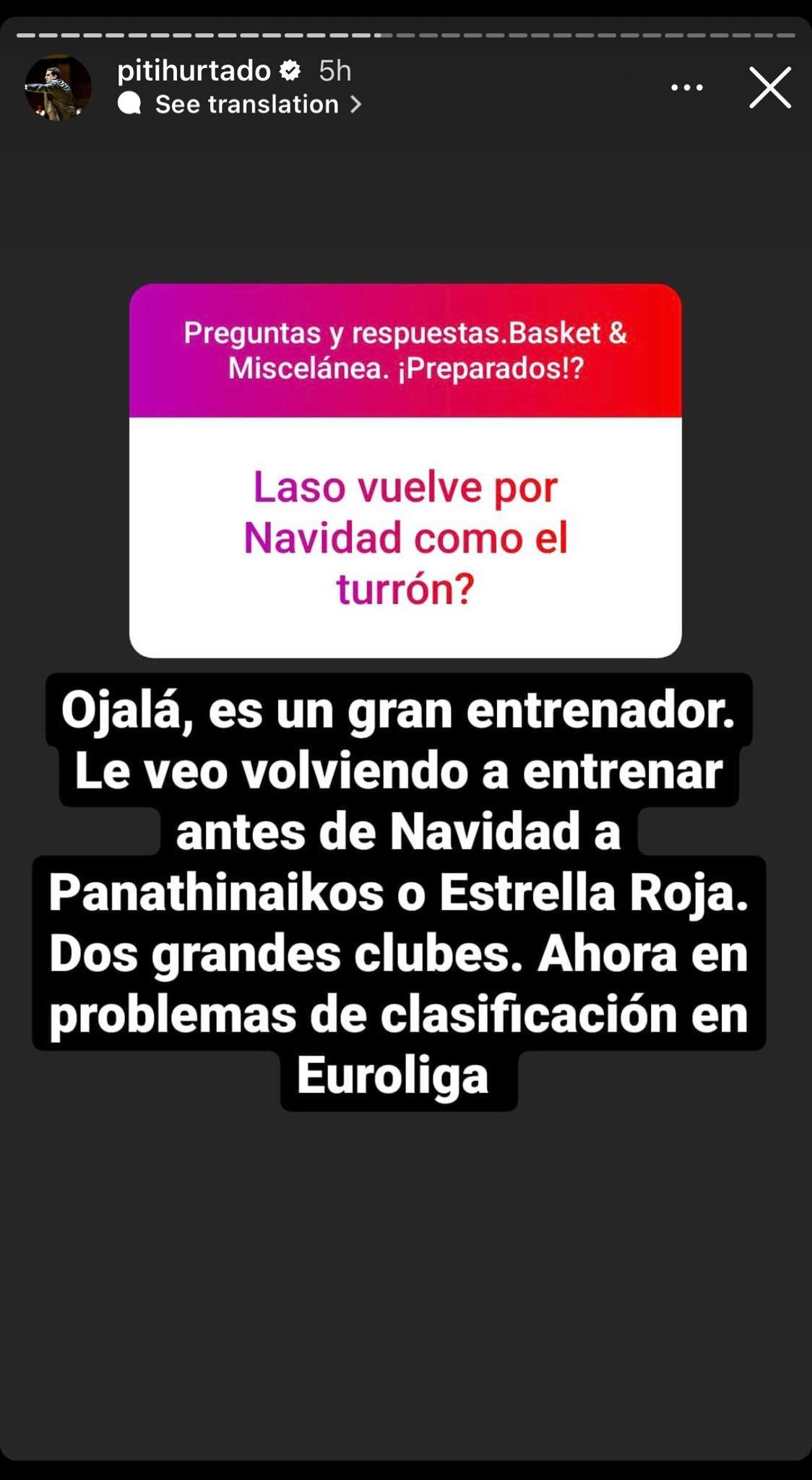 «Μακάρι, είναι μεγάλος προπονητής, τον βλέπω να επιστρέφει πριν τα Χριστούγεννα, στον Παναθηναϊκό ή τον Ερυθρό Αστέρα, δύο μεγάλα κλαμπ που έχουν προβλήματα να προκριθούν στην Euroleague», ήταν η χαρακτηριστική απάντηση του Ουρτάδο.