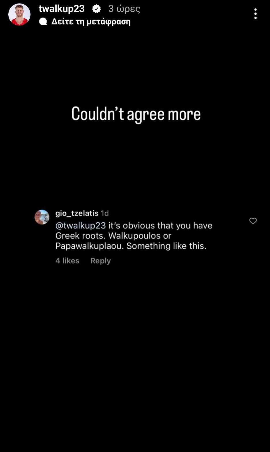 Ο Αμερικανός γκαρντ ανέβασε σε ιστορία στο Instagram, ένα σχόλιο ενός follower του που ανέφερε ότι: "Είναι προφανές ότι έχεις Ελληνικές ρίζες. Walkupoulos ή Papawalkuplaou. Κάτι αντίστοιχο".