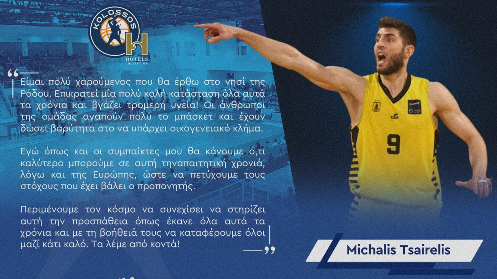 Ο Μιχάλης Τσαϊρέλης θα φορέσει την φανέλα του Κολοσσού την νέα σεζόν, με τον Έλληνα άσο να μιλά για την επερχόμενη παρουσία του στην ομάδα της Ρόδου.