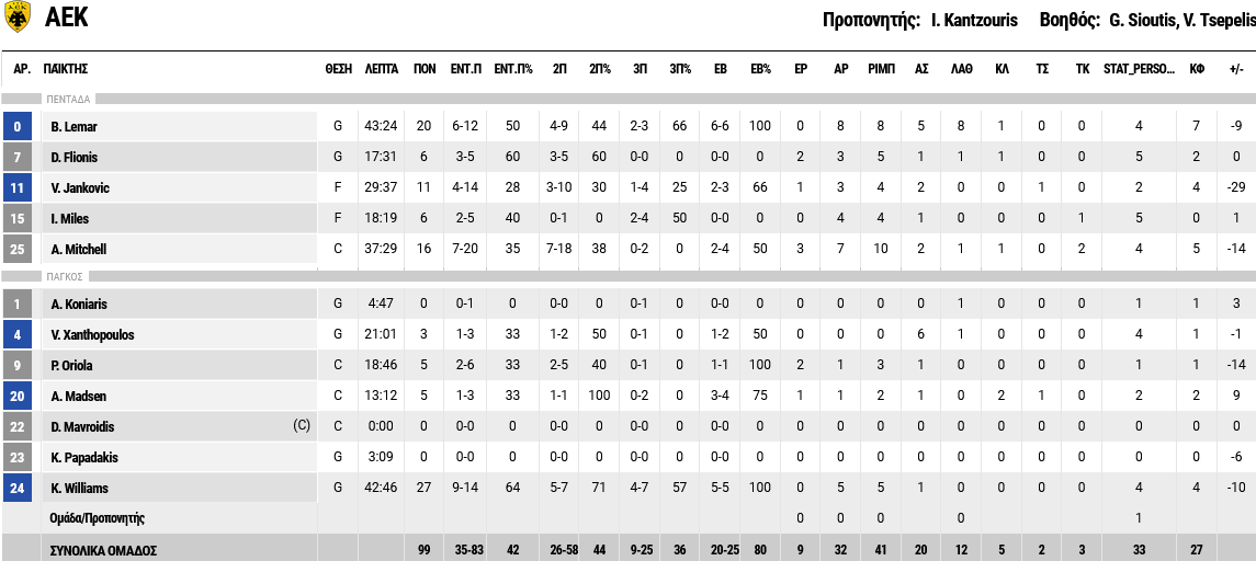 Ξεχώρισαν: 22 πόντους είχε ο Φρανσίσκο, 16 ο Χάμερ και 14 ο Κασελάκης, ενώ ο Μπίλαν είχε 12 πόντους και ισάριθμα ριμπάουντ. Για την ΑΕΚ, 27 πόντους είχε ο Γουίλιαμς, 20 ο Λεμάρ και 16 πόντους με 10 ριμπάουντ ο Μίτσελ.