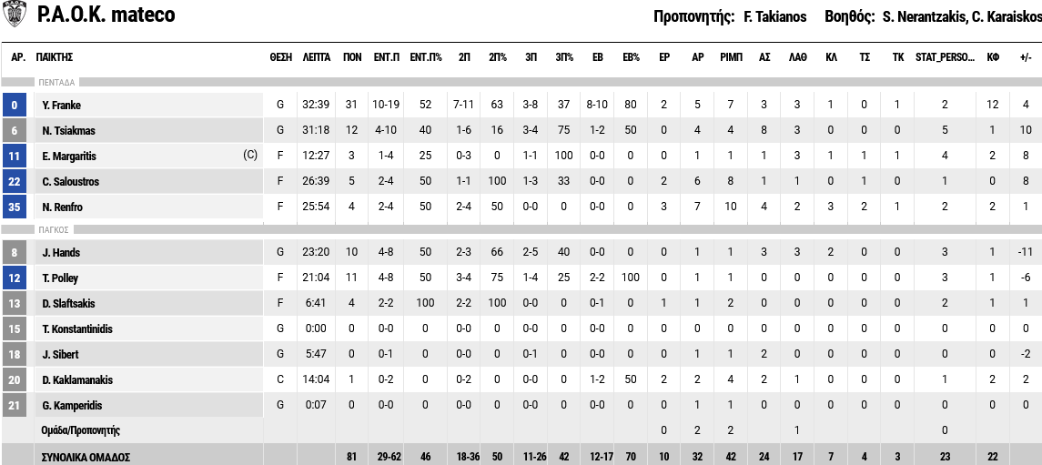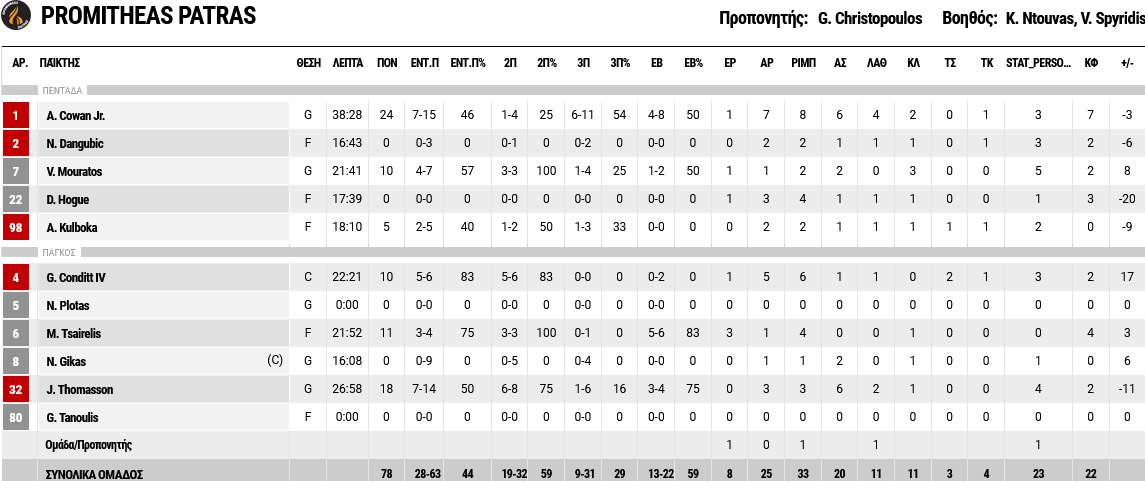 Ξεχώρισαν: Τσιακμάς με 12, Πόλεϊ με 11 και Χαντς με 10 πόντους, ξεχώρισαν από τον ΠΑΟΚ, ενώ για τον Προμηθέα, ο Κάουαν είχε 24 πόντους, οκτώ ριμπάουντ και έξι ασίστ και ο Τόμασον 18 πόντους.