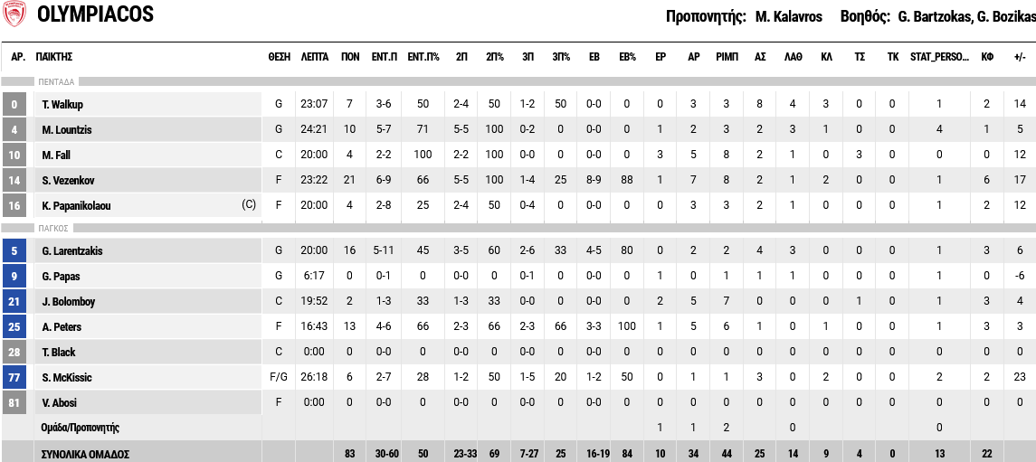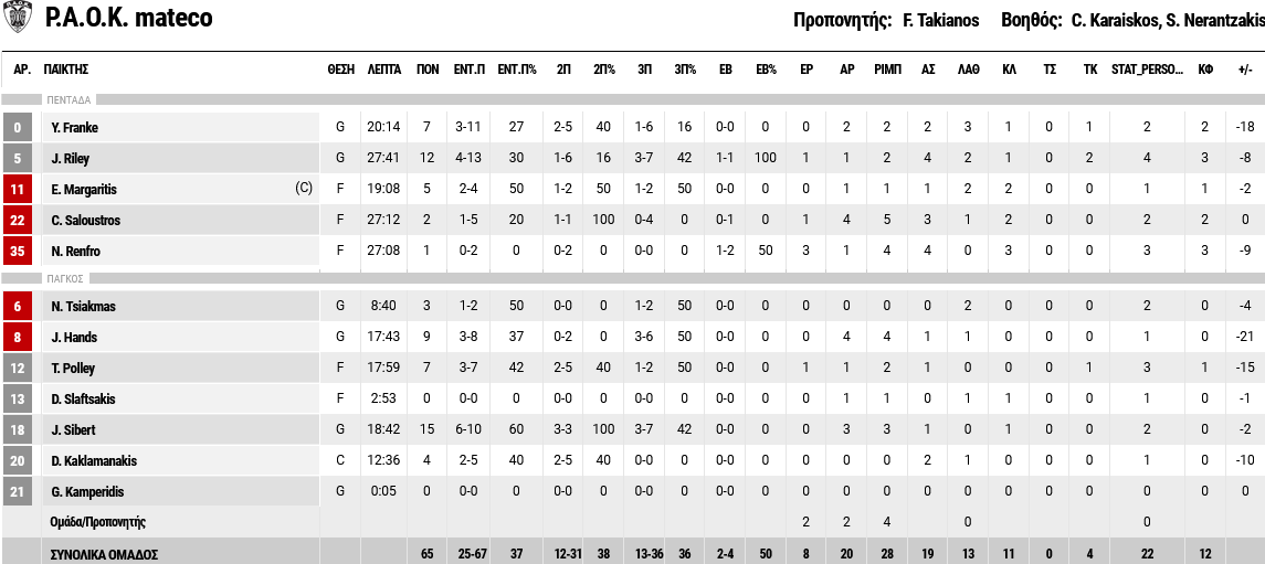 Ξεχώρισαν: Λαρεντζάκης με 16 πόντους και Πίτερς με 13 ξεχώρισαν από πλευράς Ολυμπιακού, ενώ για τον ΠΑΟΚ, ο Σίμπερτ είχε 15 πόντους και ο Ράιλι 12.