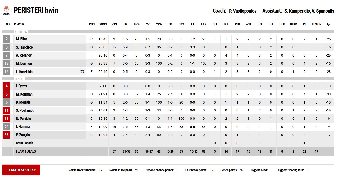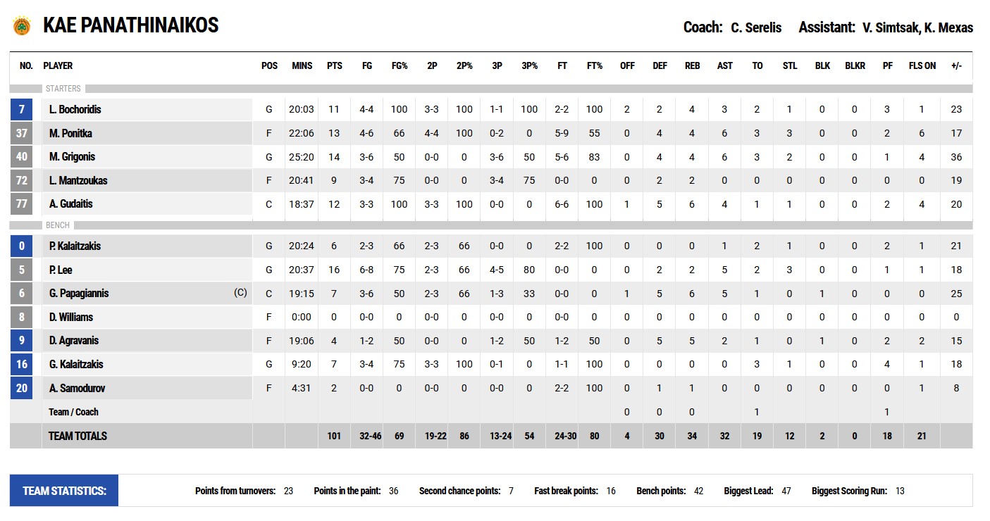 Η μεγαλύτερη διαφορά: +47 (101-54, 39') για τον Παναθηναϊκό. Το Περιστέρι δεν προηγήθηκε σε κανένα σημείο του αγώνα