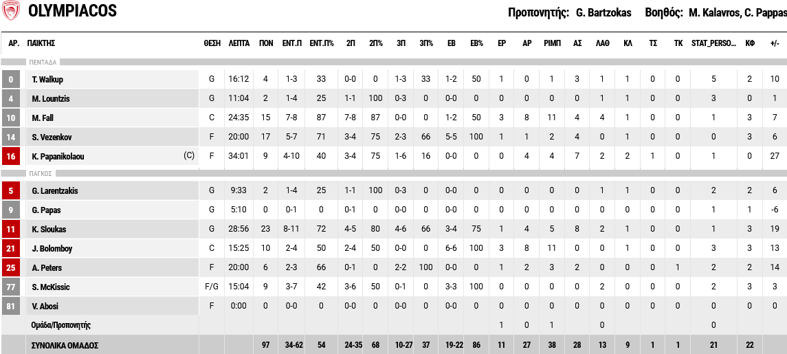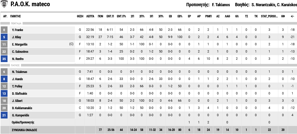 Ξεχώρισαν: Ασταμάτητος ο Φαλ με 15 πόντους και 11 ριμπάουντ, ενώ για τον ΠΑΟΚ ο Ράιλι είχε 27 πόντους.