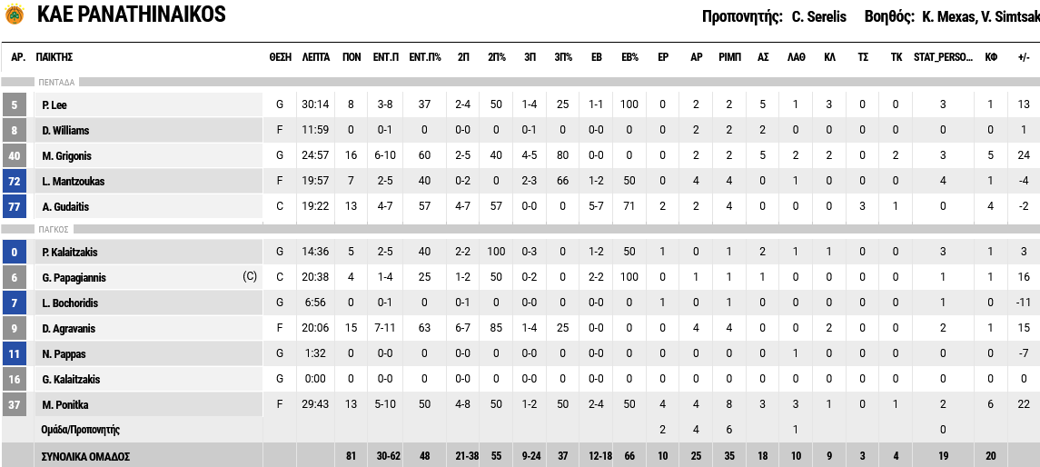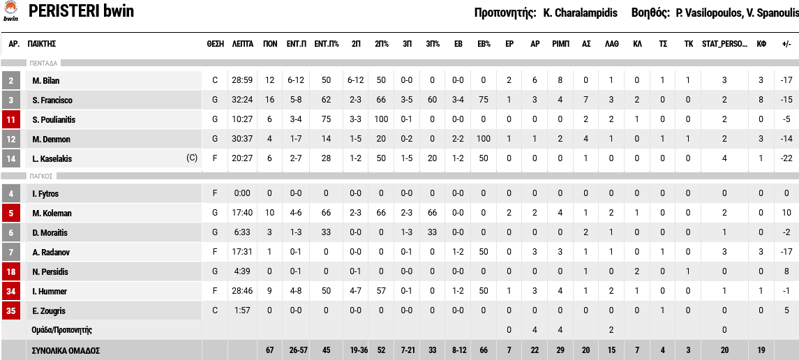 Ξεχώρισαν: Εξαιρετικός ο Γκριγκόνις στο α’ μέρος, με τον Λιθουανό να έχει 16 πόντους, όσους σημείωσε και ο Φρανσίσκο για το Περιστέρι.
