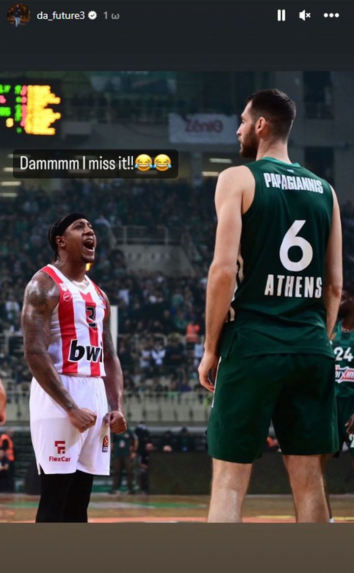 Ο Αμερικανός γκαρντ του Ολυμπιακού δεν είναι στη λίστα των ξένων που θα αγωνιστούν στα play offs του πρωταθλήματος αλλά φαίνεται πως του λείπουν τα ντέρμπι με τον «αιώνιο» αντίπαλο.