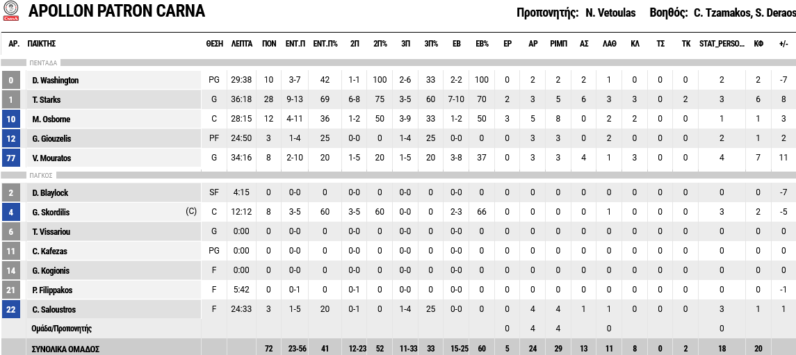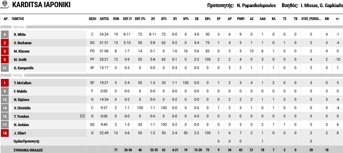 Ξεχώρισαν: 10 πόντους σημείωσε ο Γουάσινγκτον, ενώ για την Καρδίτσα, ο Γουάιτ είχε 19 πόντους και εννέα ριμπάουντ.