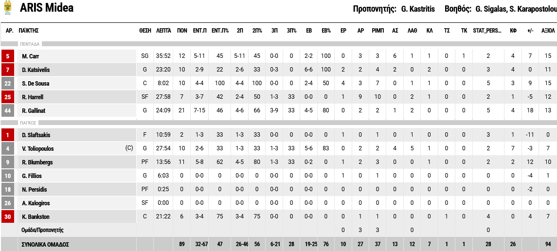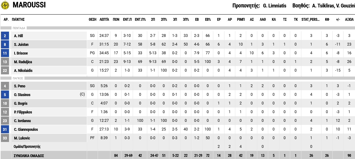 Ξεχώρισαν: 12 πόντους σημείωσε ο Καρ και ο Μπλούμπεργκς για τον Άρη που είχε έξι διψήφιους παίκτες, ενώ για το Μαρούσι, 23 πόντους είχε ο Ραντούλιτσα, ενώ double – double έκανε ο Τζούστον με 20 πόντους και 10 ριμπάουντ και ο Μπρίσκο με 17 πόντους και 10 ασίστ.