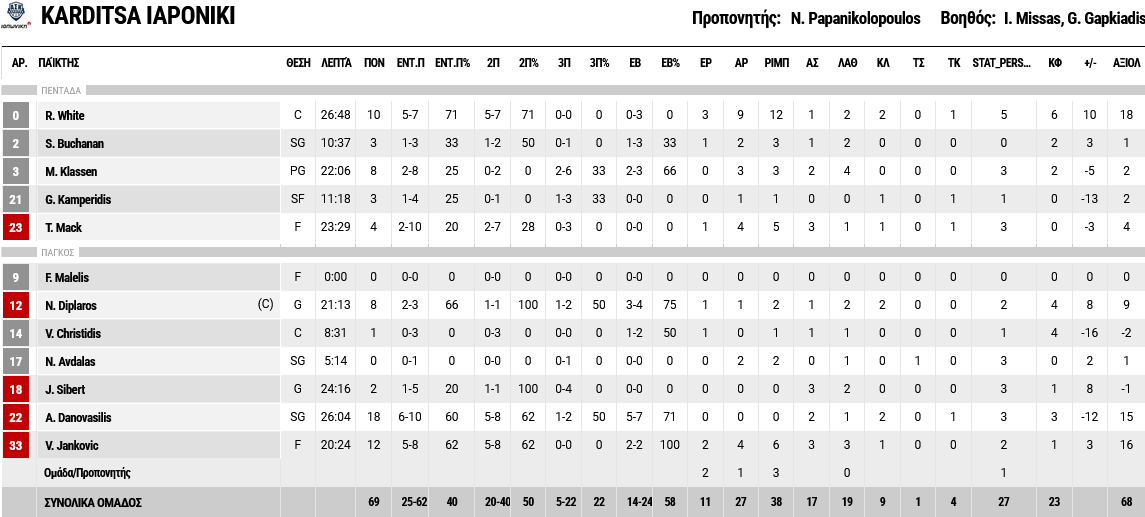 Ξεχώρισαν: 12 πόντους πέτυχε ο Άλστον, ενώ για την Καρδίτσα, 18 πόντους πέτυχε ο Δανοβασίλης