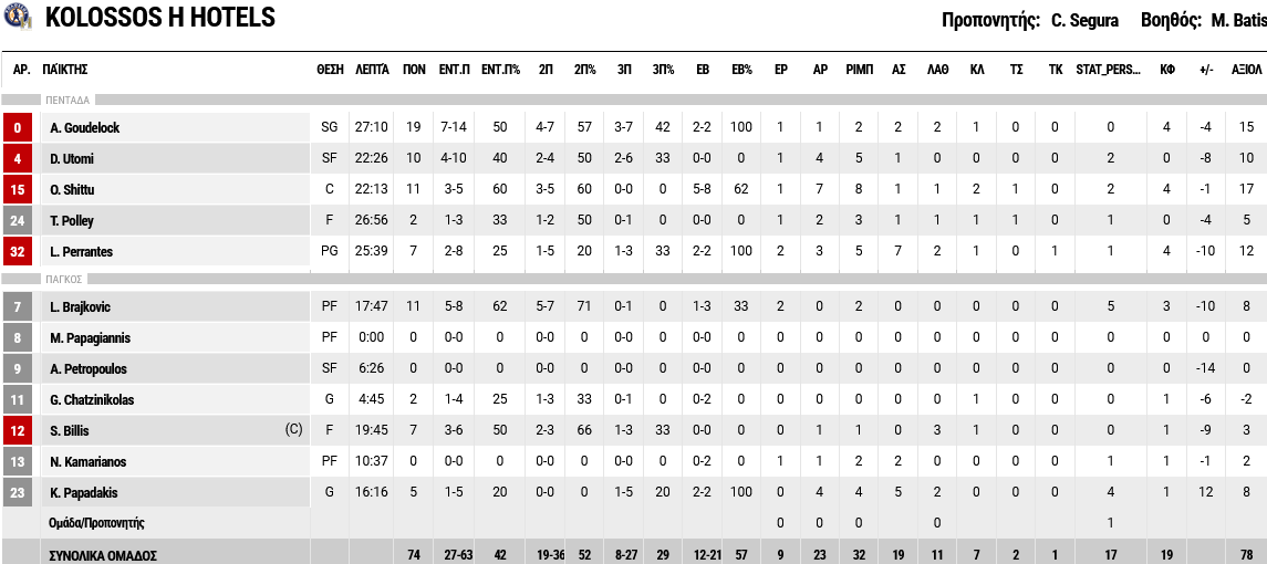 Ξεχώρισαν: Απολαυστικός ο Μπρίσκο με 20 πόντους και 10 ασίστ. Για τον Κολοσσό, 19 πόντους πέτυχε ο Γκάουντλοκ.