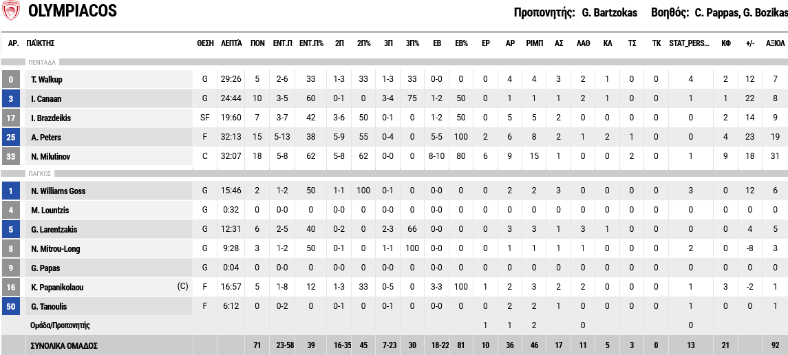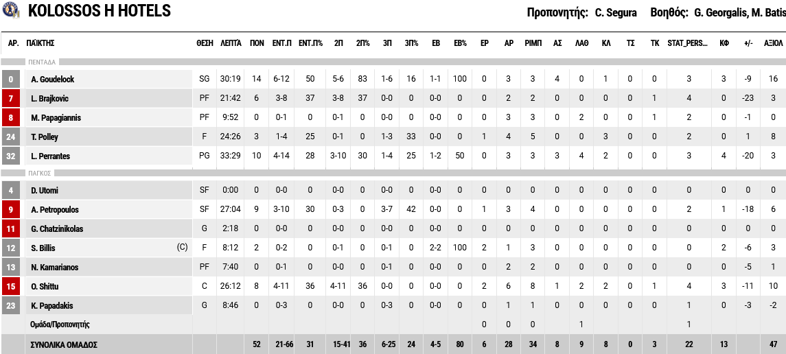 Ξεχώρισαν: 15 πόντους σημείωσε ο Πίτερς και 10 ο Κάνααν για τον Ολυμπιακό, ενώ από πλευράς Κολοσσού, ο Γκάουτλοκ είχε 14 πόντους και ο Περάντες 10.
