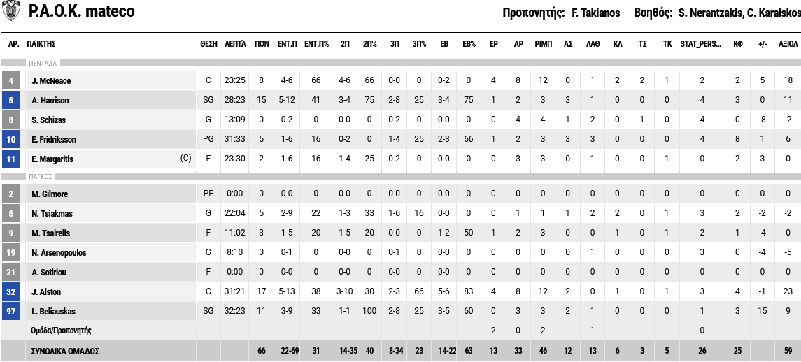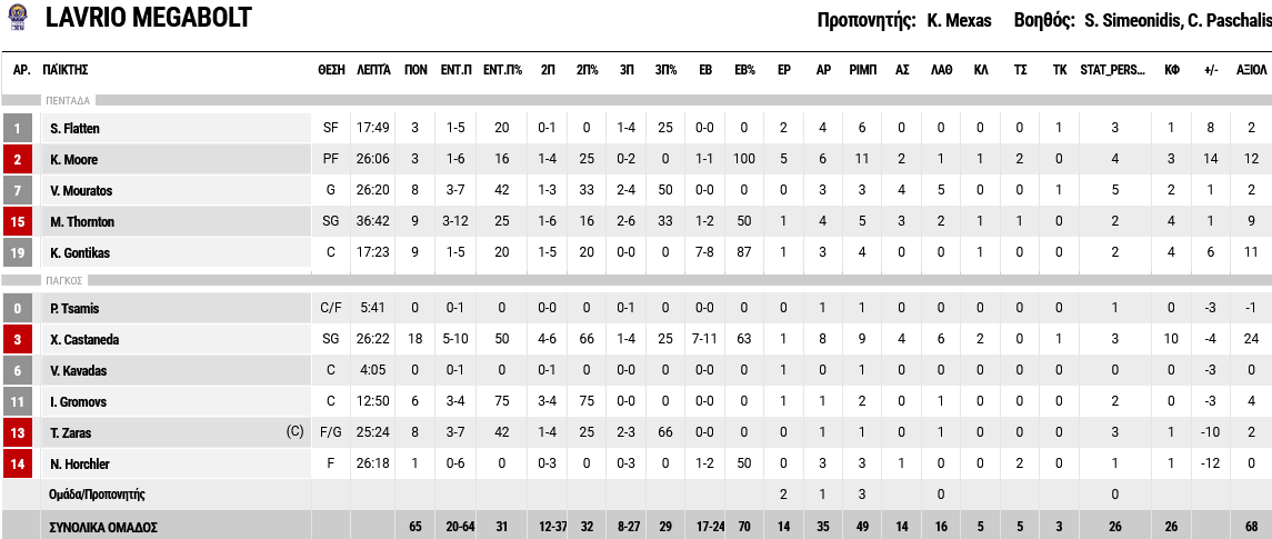 Ξεχώρισαν: 15 πόντους πέτυχε ο Χάρισον, ενώ για το Λαύριο, ο Καστανέδα είχε 18 πόντους και εννέα ριμπάουντ, όμως ήταν ο μοιραίος για την ομάδα του, με τα βήματα στην τελευταία επίθεση της παράτασης.