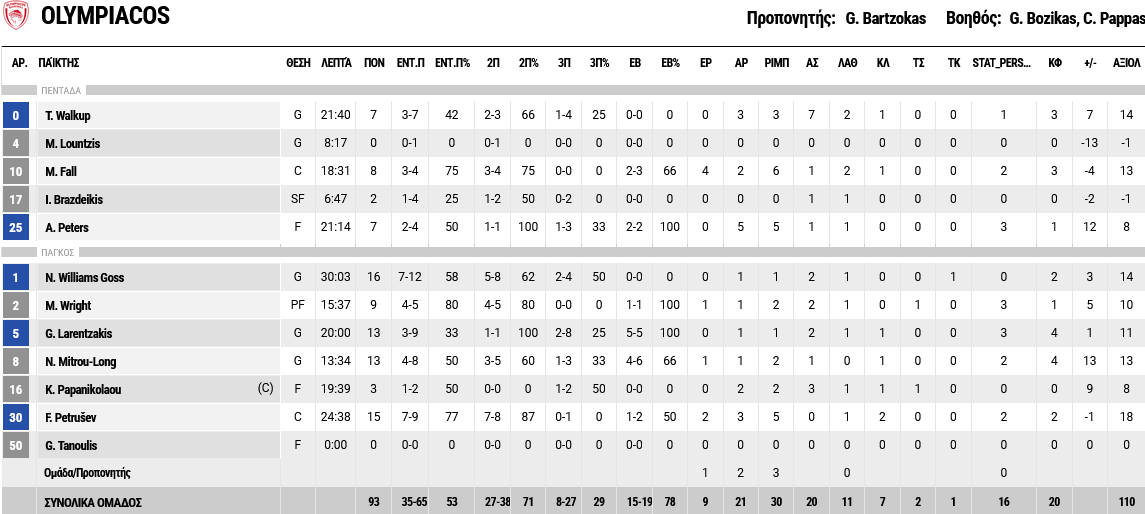 Ξεχώρισαν: 15 πόντους και πέντε ριμπάουντ είχε ο Πετρούσεβ, με τους Μήτρου – Λονγκ και Λαρεντζάκη να έχουν από 13 πόντους και τον «Λάρε» να πετυχαίνει τους οκτώ από αυτούς, όταν το παιχνίδι είχε… στραβώσει για τους «ερυθρόλευκους». Για το Μαρούσι, 25 πόντους είχε ο Χιλ, 16 πόντους και επτά ριμπάουντ ο Ραντούλιτσα και 14 πόντους ο Γιαννόπουλος.