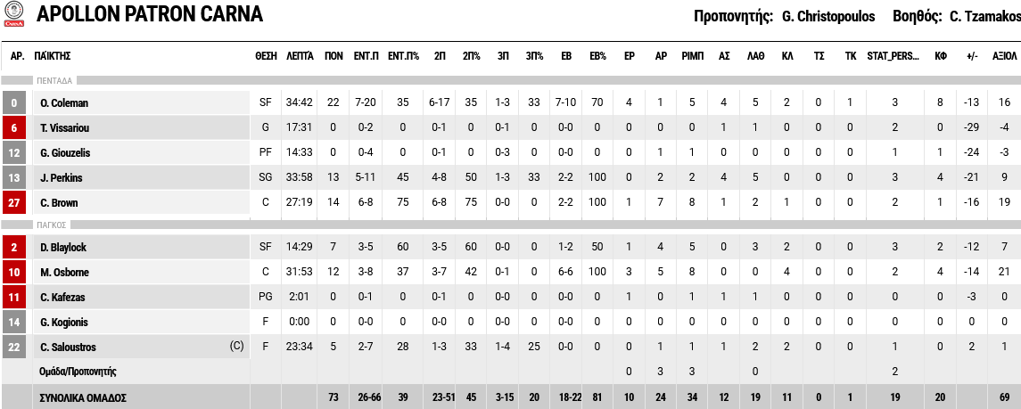 Ξεχώρισαν: «Καυτοί» Νικολαΐδης και Κόζι, με 19 και 18 πόντους αντίστοιχα, ενώ για τον Απόλλωνα, που… κατέρρευσε στην τελευταία περίοδο, ο Κόουλμαν είχε 22 πόντους και ο Μπράουν 14.