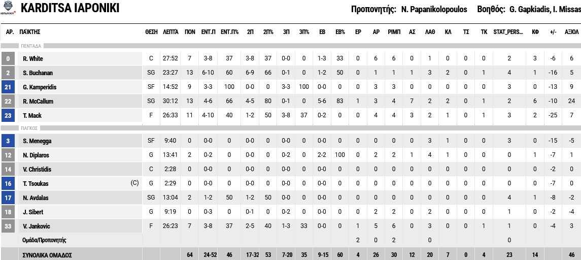 Ξεχώρισαν: 15 πόντους σημείωσε ο Μήτογλου, ενώ για την Καρδίτσα, Μπιουκαναν και ΜακΚάλουμ είχαν από 13 πόντους έκαστος.