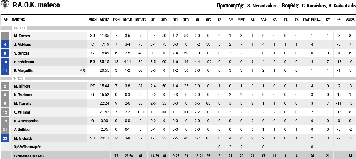 Ξεχώρισαν: 14 πόντους σημείωσε ο Γκριγκόνις, ενώ για τον ΠΑΟΚ, ο Μίχαλακ είχε 14 πόντους και ο Φρίντρικσον 13 πόντους και εννέα ασίστ.