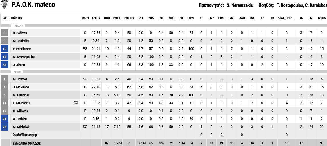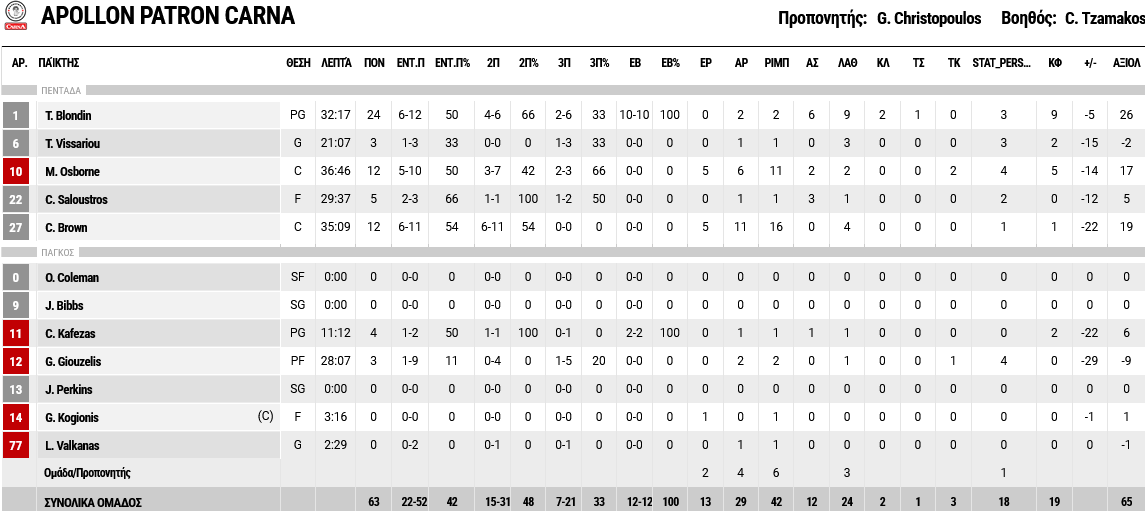 Ξεχώρισαν: Τσιακμάς με 13 πόντους και ΜακΝίς με 11 πόντους και οκτώ ριμπάουντ, ξεχώρισαν για τους νικητές. Από πλευράς Απόλλωνα, ο Μπλοντίν είχε 24 πόντους, με τον Μπράουν να έχει 12 πόντους και 16 ριμπάουντ και τον Όσμπορν 12 πόντους και 11 ριμπάουντ.