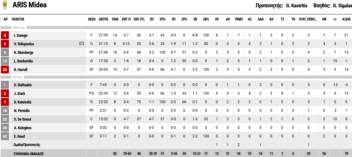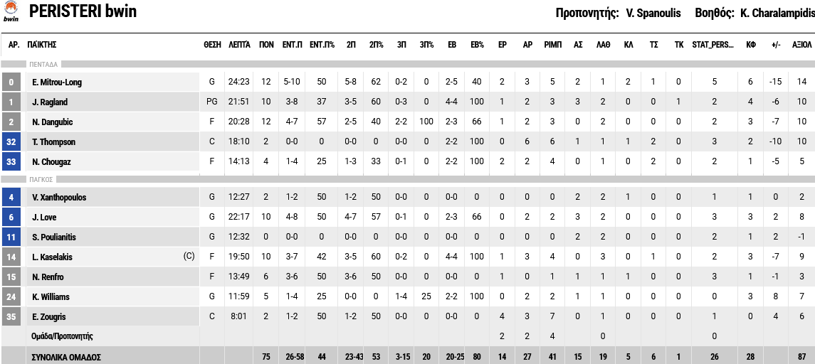 Ξεχώρισαν: 14 πόντους σημείωσε ο Σανόγκο και 12 ο Σταρκς, ενώ για το Περιστέρι, Μήτρου – Λονγκ και Ντάγκουμπιτς είχαν από 12 πόντους έκαστος.